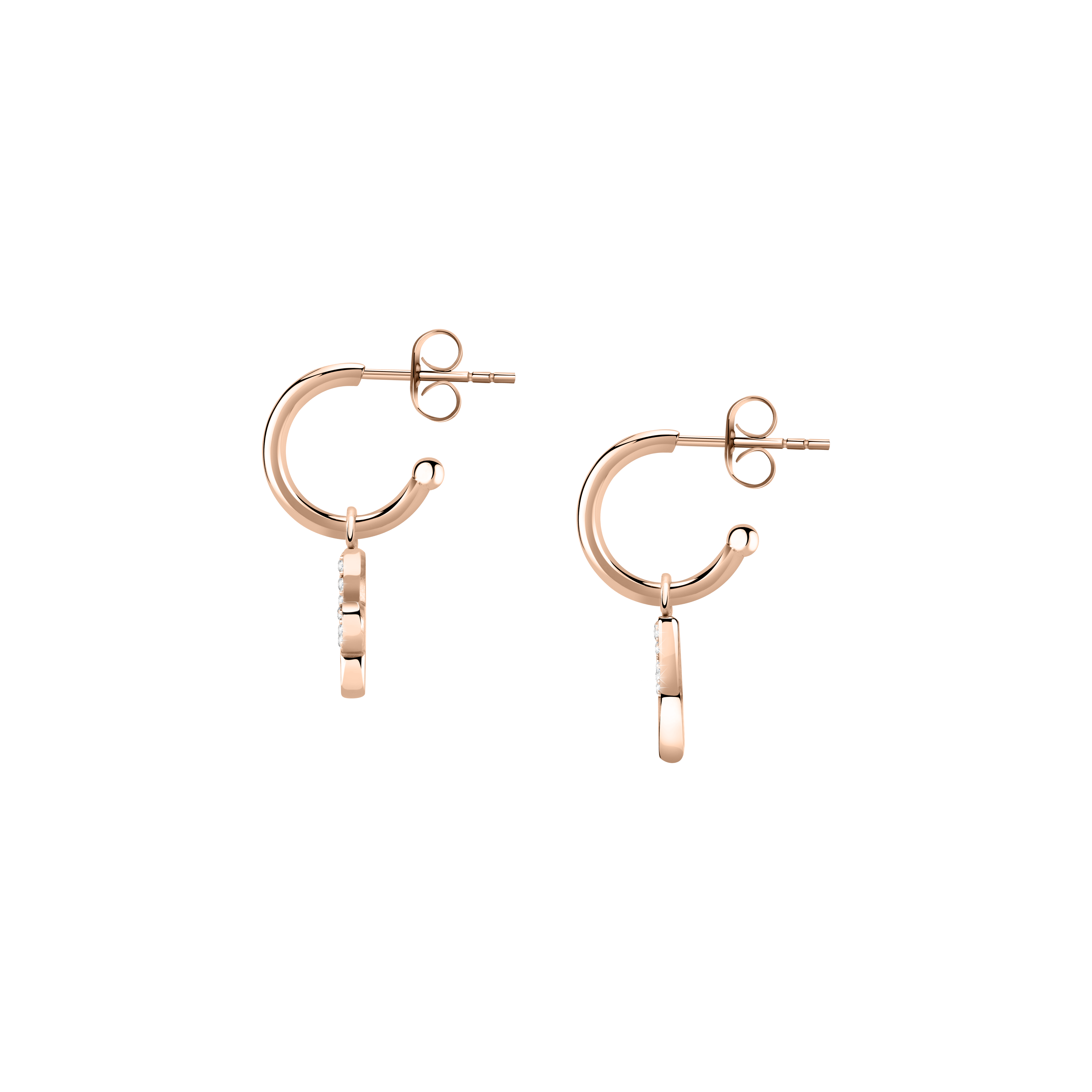 These charming earrings are a symbol of refinement and femininity, designed to highlight your natural beauty in a subtle and sophisticated way. With an elegant and contemporary design, these earrings are made of stainless steel and plated with PVD rose gold for a refined and sparkling appearance. The earrings are encrusted with white crystals, adding a subtle touch of sparkle and elegance. These earrings are thin enough to be worn daily, yet sparkling enough for special events.