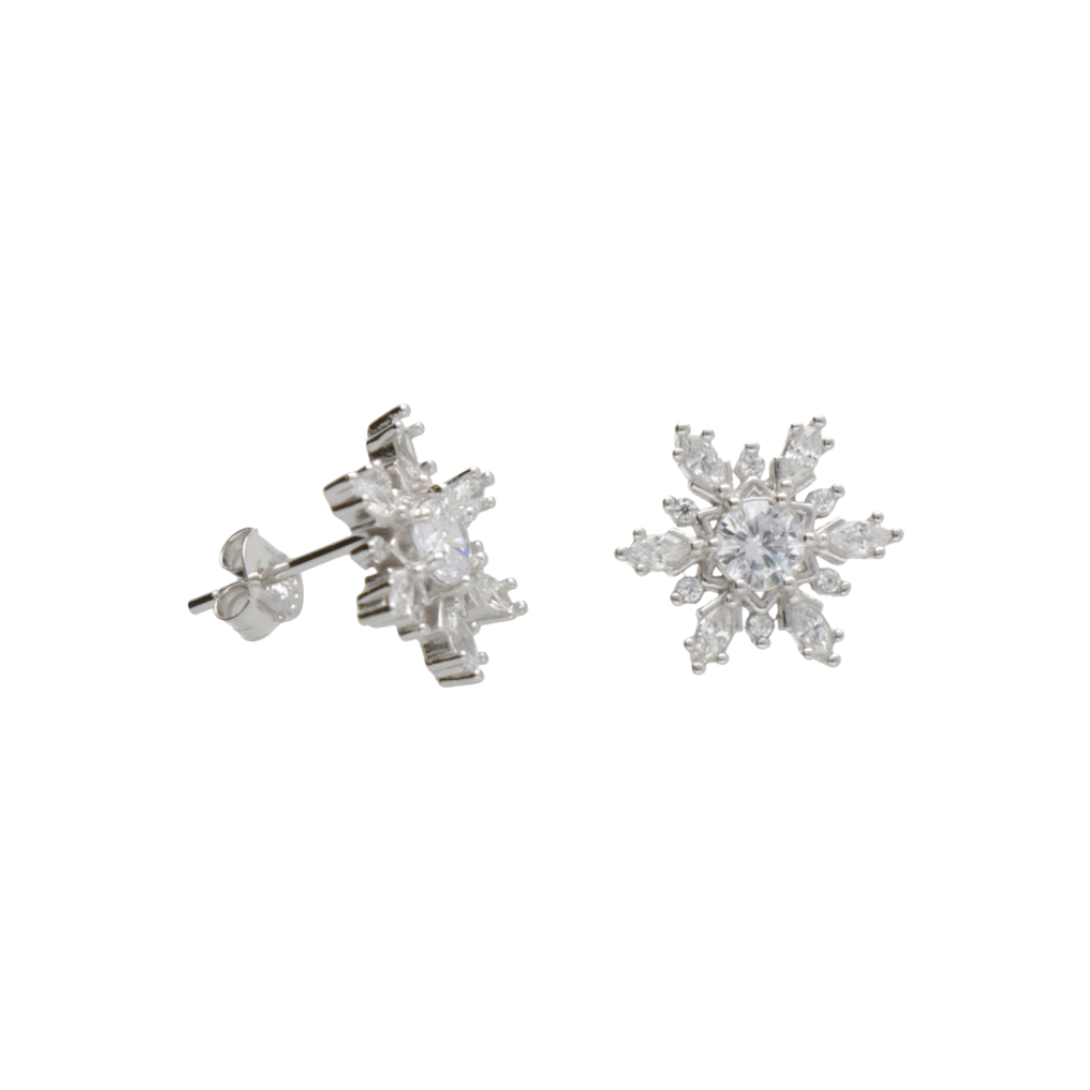 Earrings with screw backs, snowflake-shaped, rhodium-plated.
