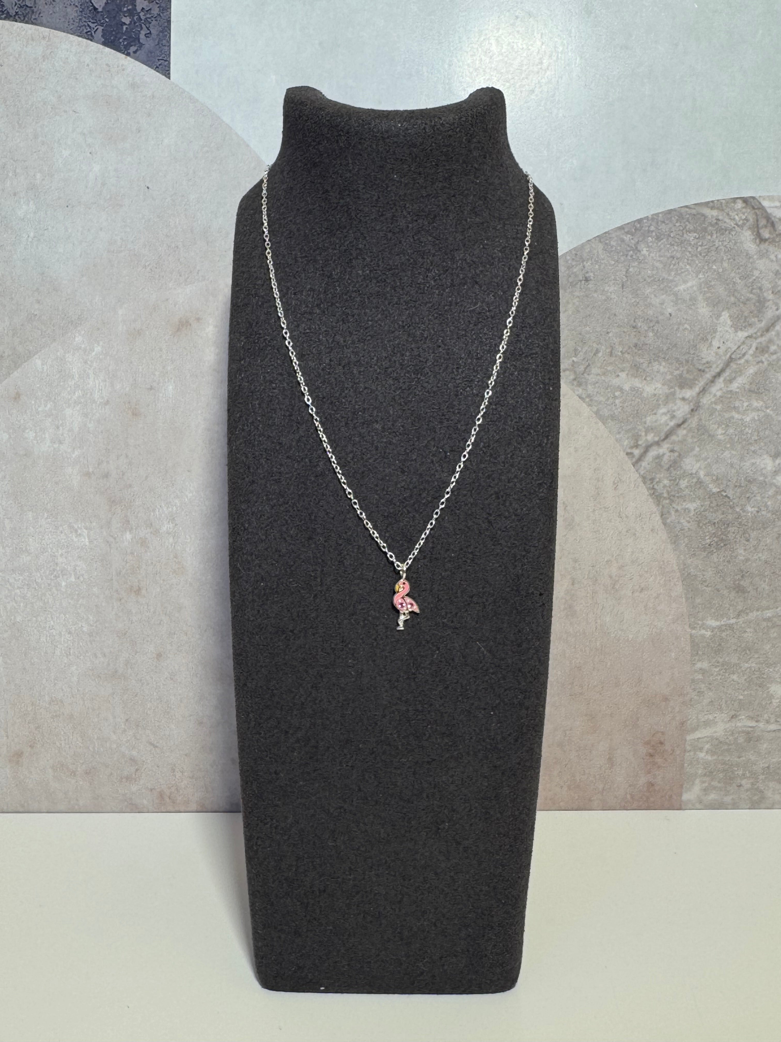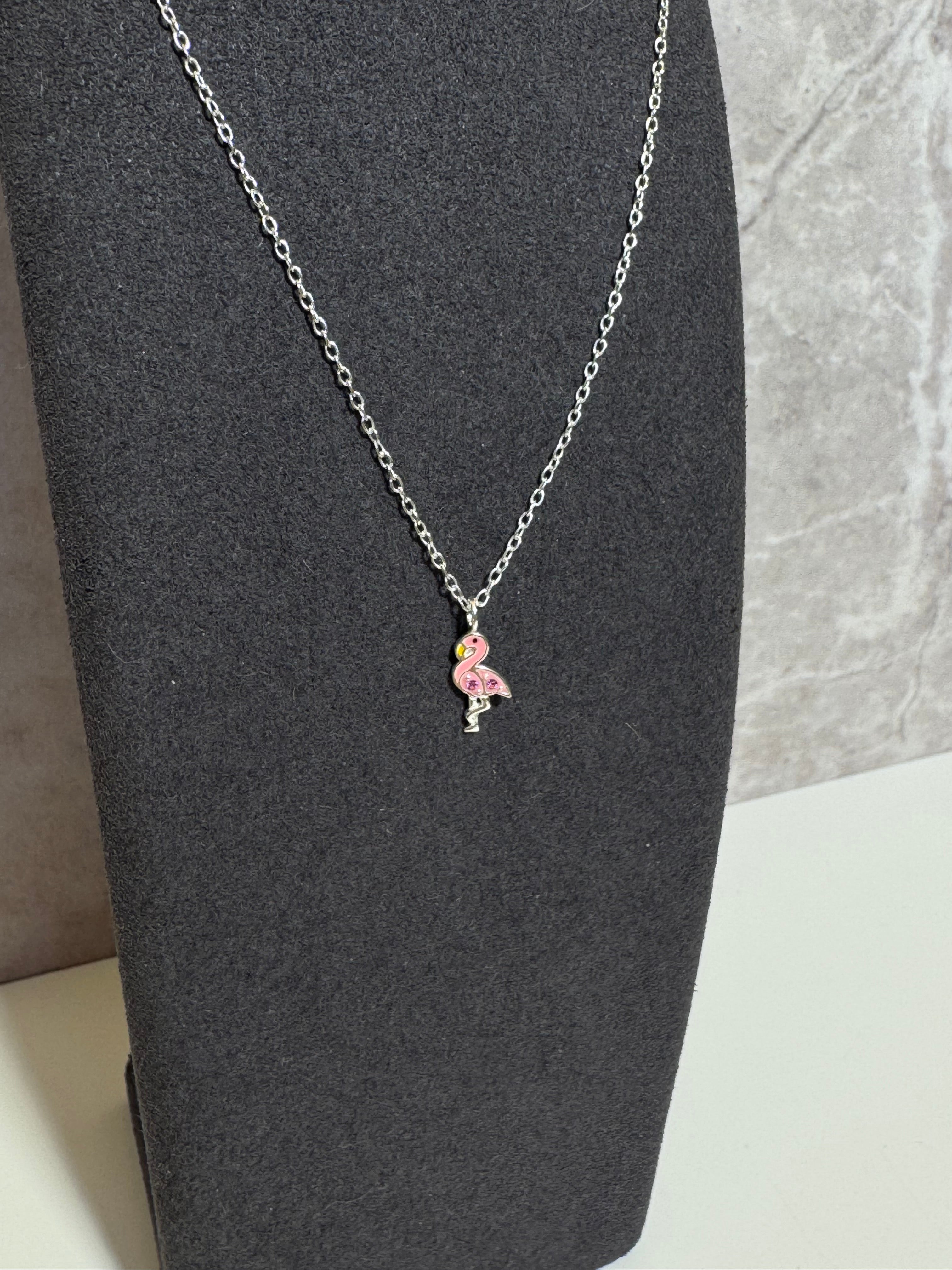 This flamingo pendant necklace is crafted from genuine 925 sterling silver, expertly plated with 999‑fine silver and sealed with an E‑coat finish for superior durability and lasting shine. The pendant measures 5.3 mm × 10.3 mm and weighs just 1.00 g of silver, ensuring a lightweight, comfortable wear. Suspended from a slender 1 mm‑thick chain that extends up to 39 cm with an additional 3 cm extension, it offers versatile styling options. Accented by two sparkling crystal stones and filled with pink epoxy, the flamingo motif adds a playful, colorful touch perfect for everyday elegance.