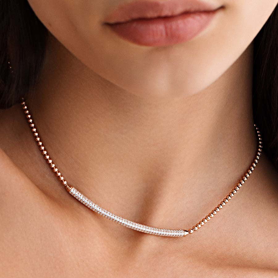 This elegant short necklace is crafted from 925‰ sterling silver with a rose gold plating, adorned with 180 sparkling white cubic zirconias for a radiant finish. Measuring 440mm, it sits beautifully around the neckline, adding a touch of sophistication to any outfit.