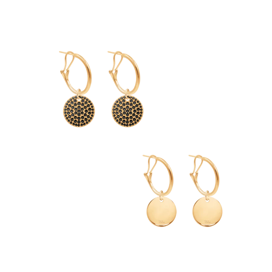 Setul este format din două pandantive circulare, placate cu aur, încrustate cu zirconiu negru și cercei cu cerc. Pandantivul circular este un simbol al armoniei, un talisman pentru emoții pozitive. Cerceii sunt placati cu aur cu aur de 18k. Pandantivele sunt realizate din alamă placată cu aur de 18k. Dimensiunea cerceilor: 2 cm. Dimensiune pandantiv: 1,5 cm. O gravură personală va adăuga un caracter unic cerceilor.