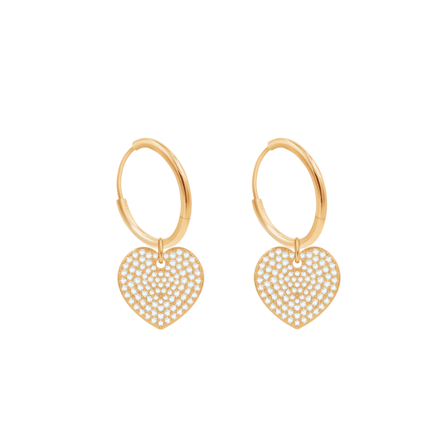 Cercei rotunzi de 1,4 cm cu inimioare de zircon alb de 1,5 cm, set placat cu aur. Cerceii noștri sunt versatili și pot fi combinați în diverse moduri, oferind libertatea de a crea un stil personalizat. La ei se pot adăuga și alte talismane, pentru un plus de originalitate și expresivitate.