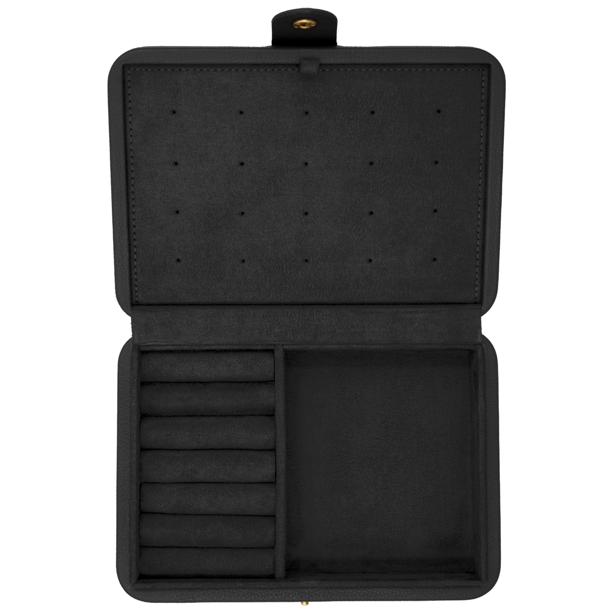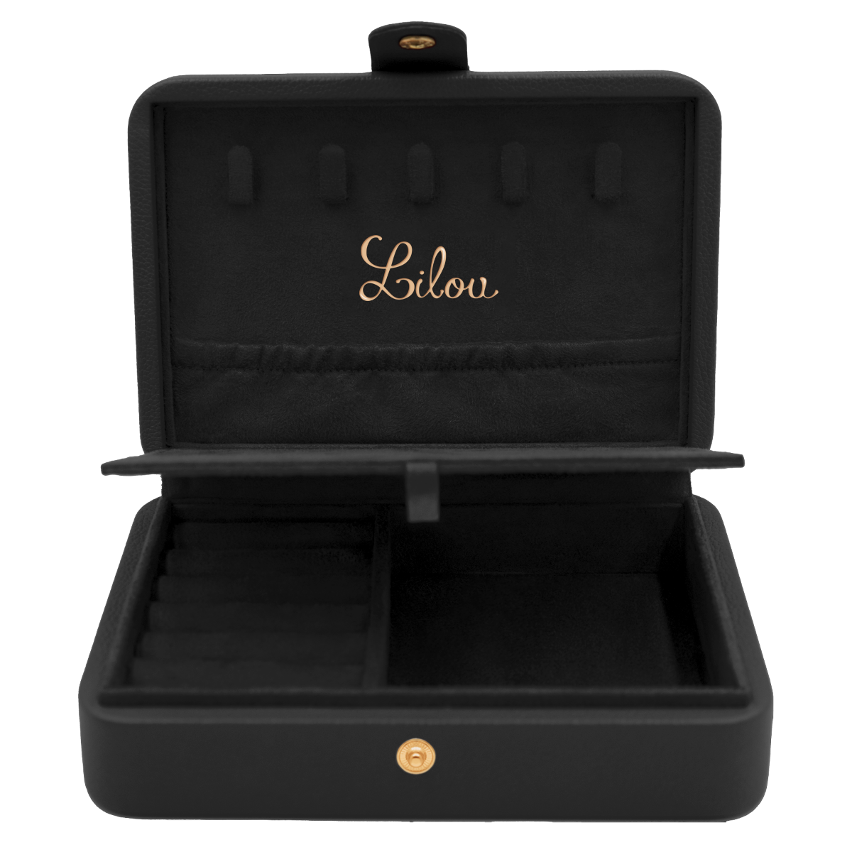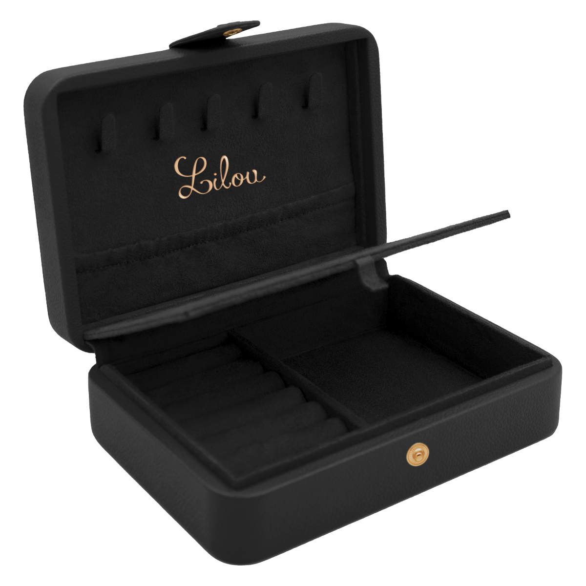 Cutie de bijuterii neagră cu căptușeală din catifea neagră. Realizată din piele italiană de înaltă calitate. Cutia are două compartimente interioare, separate printr-un spațiu destinat cerceilor. Primul compartiment are carlige pentru lanțuri și coliere, precum și un buzunar special pentru păstrarea pandantelor. Al doilea compartiment are alte două compartimente: unul pentru inele, altul pentru brățări și alte bijuterii. Cutia este lucrată manual și decorată cu un trifoi Lilou auriu. Interiorul prezintă logo-ul Lilou gravat în auriu. Dimensiuni: 17 cm x 12 cm x 5 cm