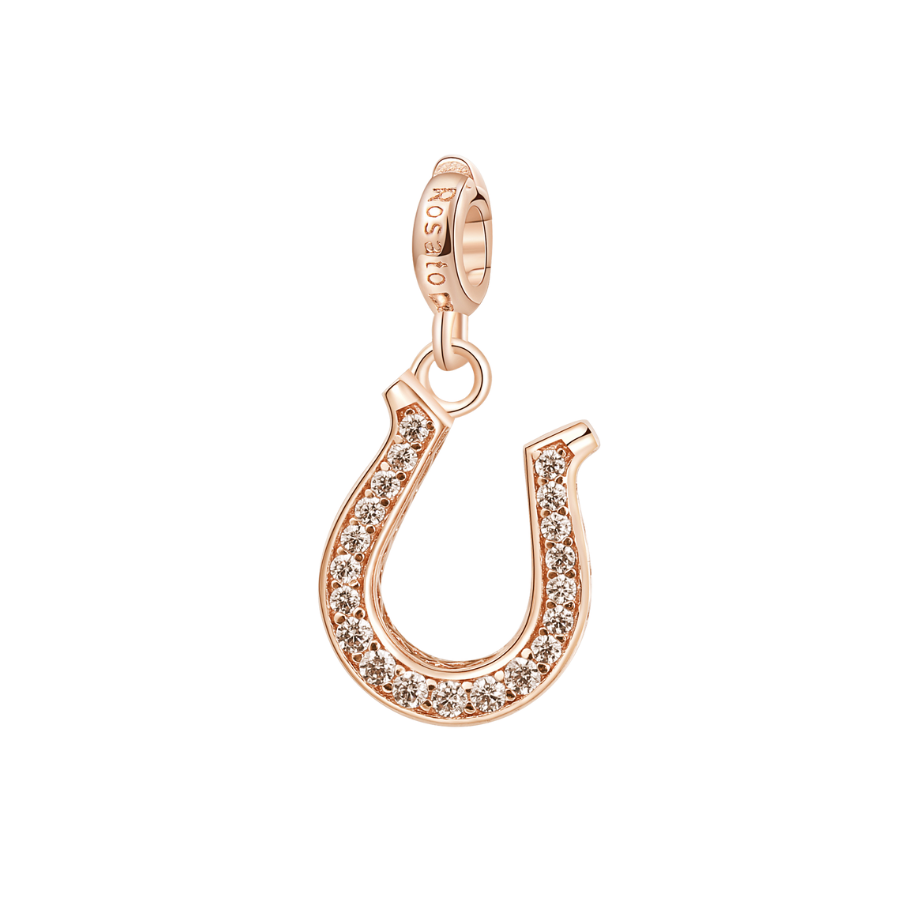 Breloc cu potcoavă din argint 925 placat cu aur roz, 20 de zirconi albi, 7 zirconi roșii, simbol al norocului și al eleganței, ROSATO.